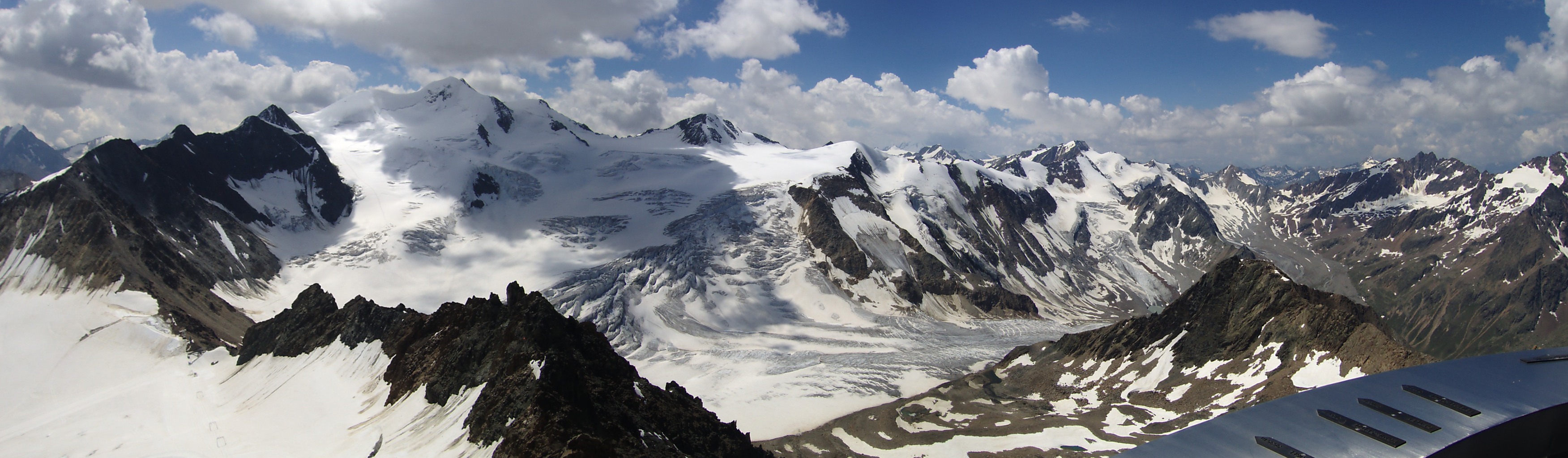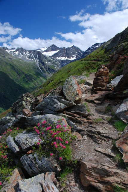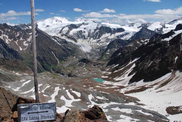 Pohľad z EisKasten na Neuer Ofenbacher Hoehenweg V strede biely Wildspitze 3774m, napravo Hinterer Brochkogel 3628m a Petersenspitze 3482.