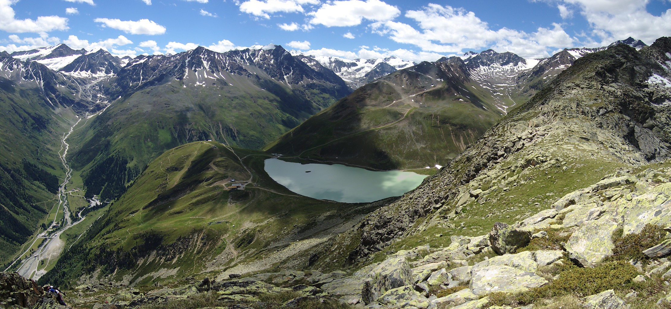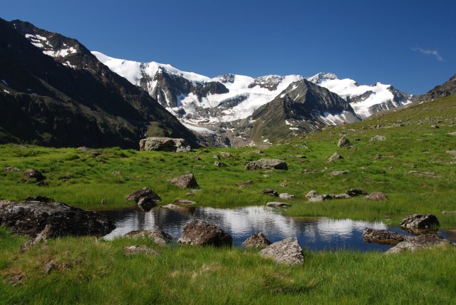 Riflsee, cca 2200m, pohlad z 2670m Grabkogla nad Pitztalom (Mandarfen, Mitelberg) 1670m