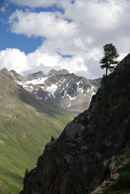 Pohľad z Fuldauer Hoehenweg smerom na ľadovec Taschach. Vľavo začína vykúkať biely Petersenspitze 3482. Čierna pyramida vpravo je Pitztaler Urkund 3197m.